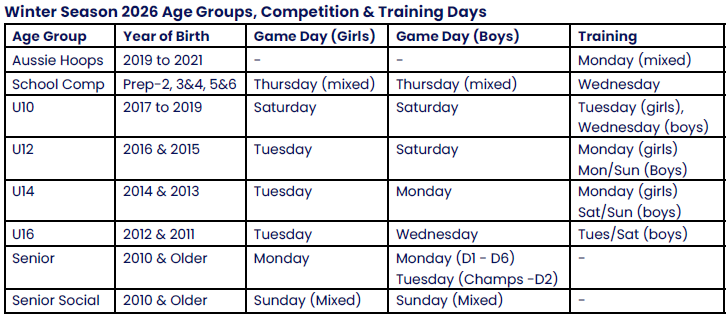 If you have more than one player interested in playing in a team in your family, please complete the form again for each player. Please check the table below for age group details for winter season including days of play, we hope to keep training on the same days they are currently, however these are subject to change depending on coach requirements.